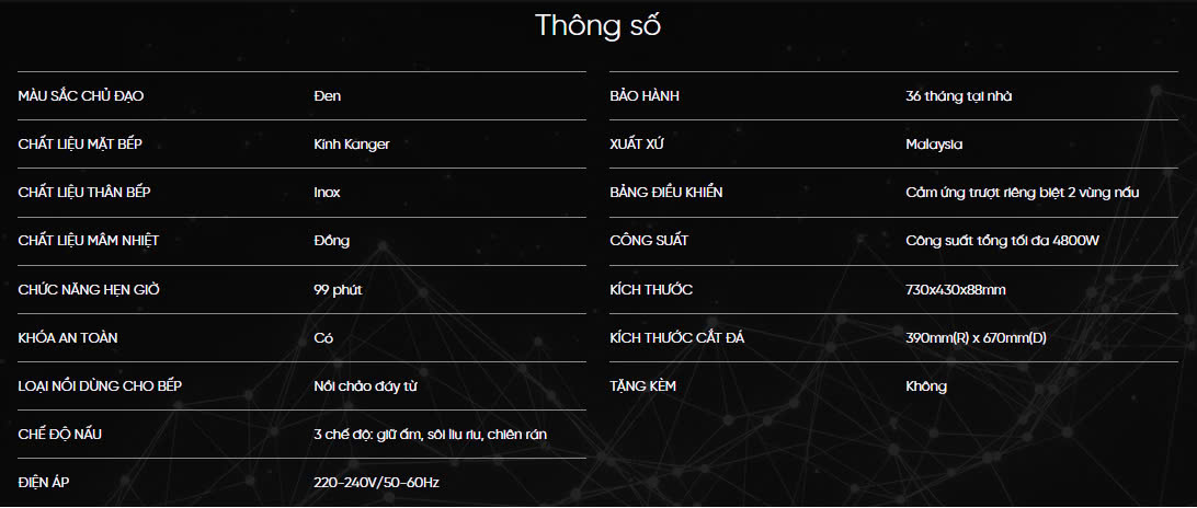 Với tổng mức công suất là 4800W, công suất mỗi vùng là 2400W, chế độ Booster sẽ giúp gia tăng công suất bếp lên mức cực đại trong thời gian ngắn, giúp tiết kiệm tối đa thời gian nấu nướng