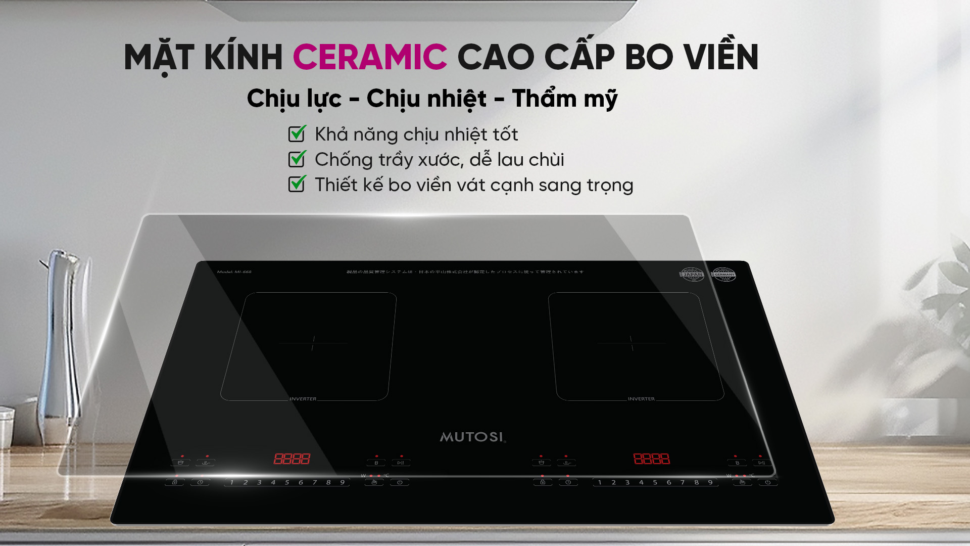 Bếp từ đôi Mutosi MI-668 sở hữu mặt kính Ceramic cao cấp được bo viền kim loại tinh tế, không chỉ mang lại vẻ đẹp sang trọng, nâng tầm không gian bếp mà còn vượt trội về độ bền. Bề mặt kính chống trầy xước hiệu quả và dễ dàng lau chùi giúp tiết kiệm thời gian làm sạch, vệ sinh bếp