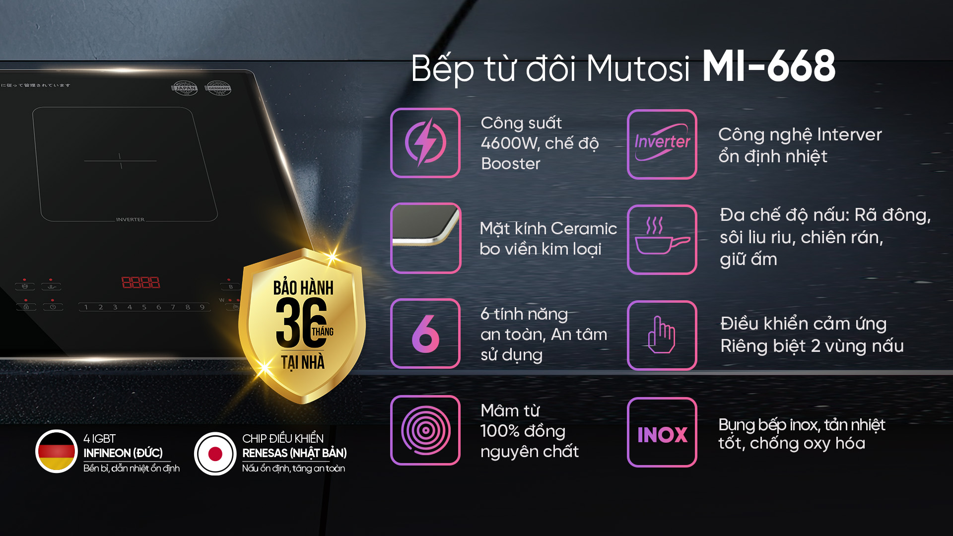 Để đảm bảo hiệu suất hoạt động tối ưu và sự bền bỉ theo thời gian, Bếp từ đôi Mutosi MI-668 được trang bị hệ thống Chip điều khiển Renesas đến từ Nhật Bản – một trong những thương hiệu hàng đầu thế giới về công nghệ điện tử. Giúp bếp ổn định điện áp, chống sốc điện và điều chỉnh công suất cực kỳ chính xác, giảm lỗi, tăng tuổi thọ.