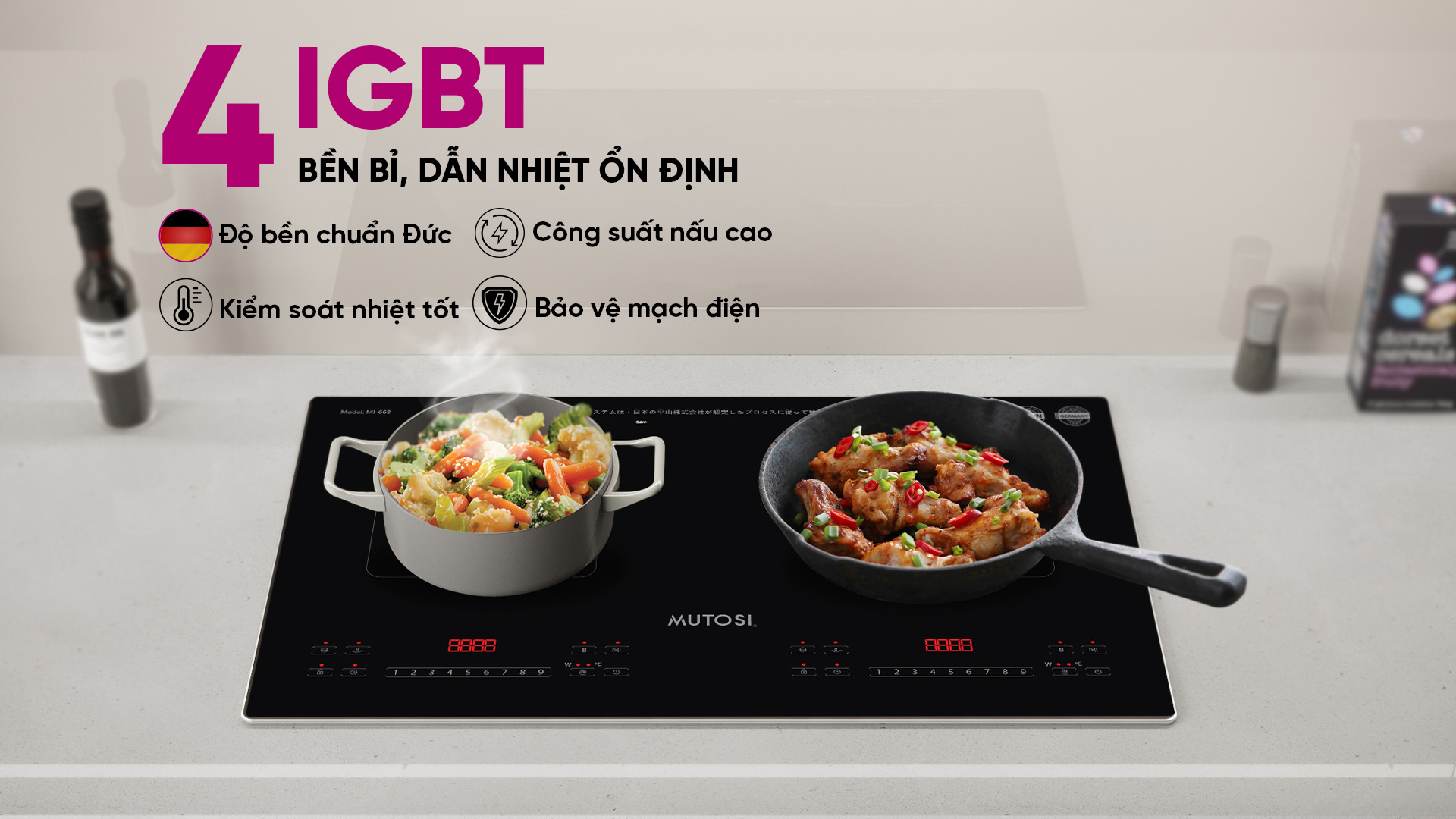 Sở hữu 4 IGBT Infineon từ Đức, bếp từ đôi Mutosi MI-668 mang đến nhiều ưu điểm vượt trội hơn hẳn các dòng bếp sử dụng 2 IGBT khác trên thị trường: giúp bạn nấu nướng an toàn với công suất cao hơn và kiểm soát nhiệt độ chính xác; Bảo vệ mạch điện