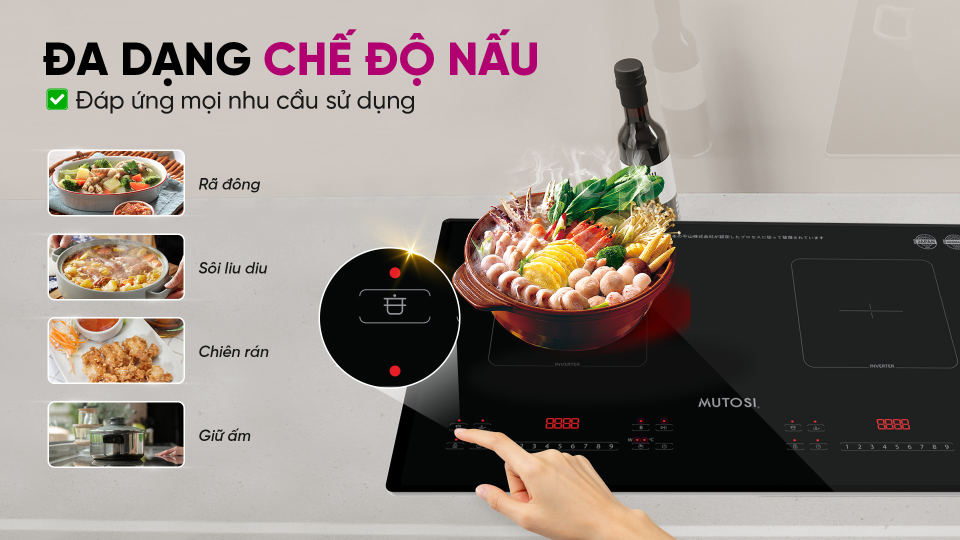 Bếp từ Mutosi MI-668 được trang bị 3 chế độ nấu chuyên biệt: Rã đông, Sôi liu riu, và Chiên rán, tối ưu hóa nhiệt độ cho từng loại món ăn, đáp ứng nhu cầu nấu đa dạng. Đặc biệt, chế độ giữ ấm tiện lợi giúp món ăn của bạn luôn nóng hổi mà không lo bị nguội hay phải hâm nóng lại.