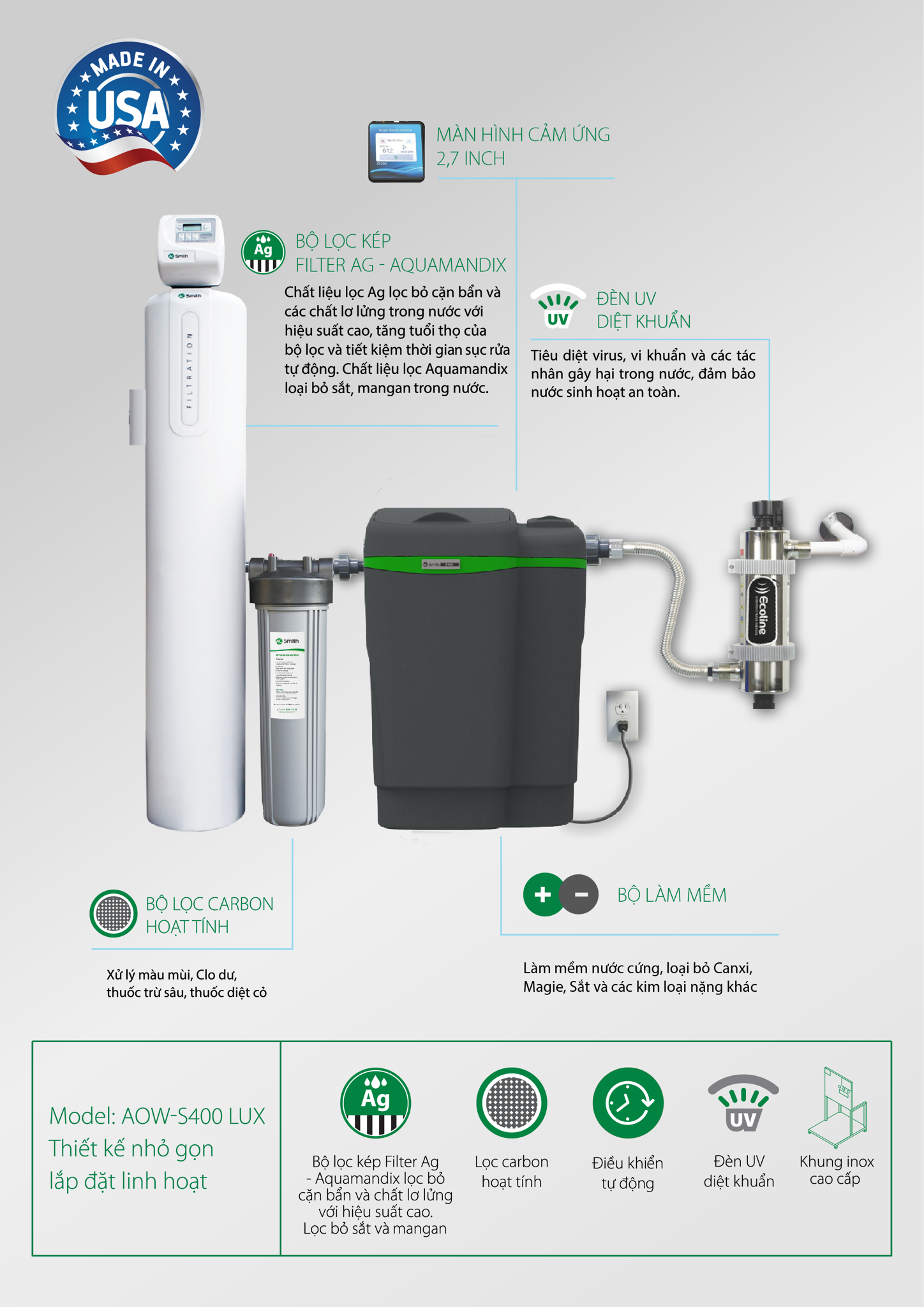 • Bộ làm mềm nhập khẩu từ Mỹ, được chứng nhận bởi tổ chức NSF International theo tiêu chuẩn. NSF/ANSI 44 (Standard 44) của Hoa Kỳ, giúp loại bỏ phần lớn Canxi, Magie, bảo vệ các thiết bị vệ sinh và các thiết bị như máy giặt, bình nước nóng…