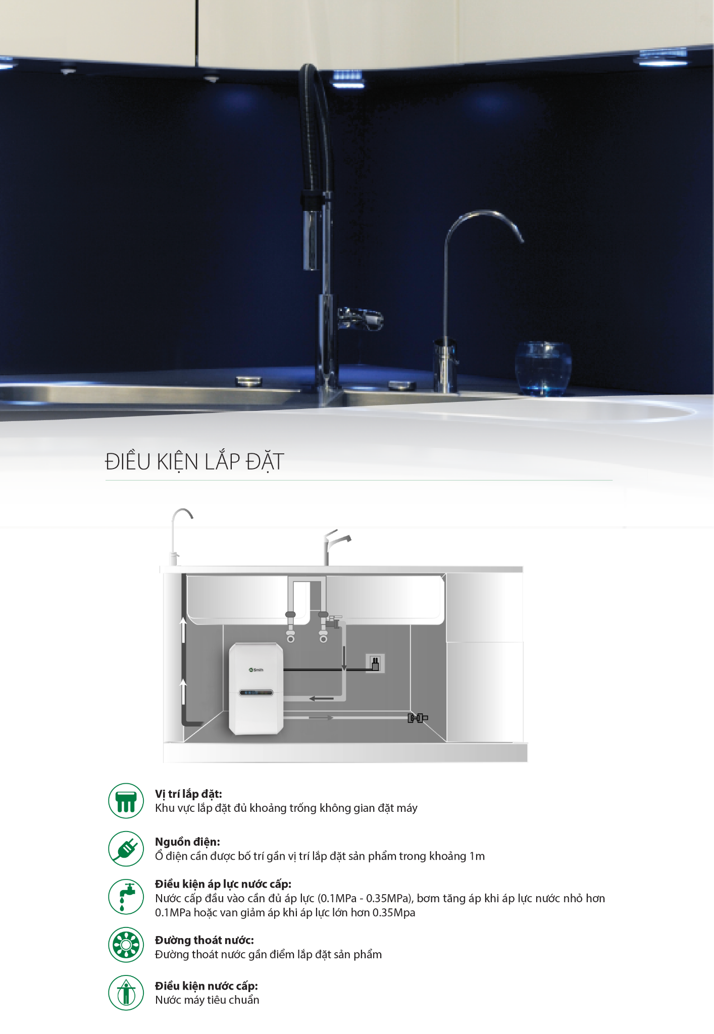 | Áp suất nước cấp phù hợp | 0.1MPa ~ 0.35MPa |