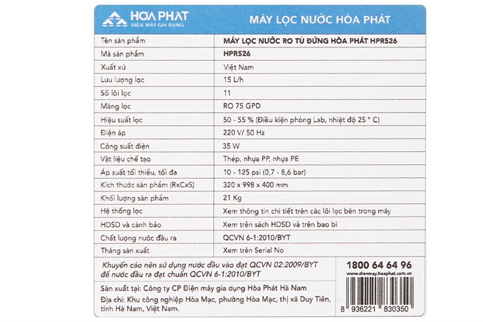 – Lõi lọc RO Hòa Phát 75 GPD (Sx Hàn Quốc): loại bỏ vi khuẩn, vi rút, kim loại nặng, hóa chất độc hại có kích thước lên đến đến 0.0001 micron giúp nước trở nên tinh khiết với các đặc điểm: không màu, không mùi, không vị, không có vi khuẩn.