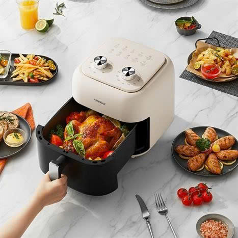 Đặc biệt, công nghệ nhiệt 360° tiên tiến đảm bảo nhiệt lượng được phân bổ đều khắp khoang nồi, giúp thức ăn chín vàng giòn từ mọi phía mà không cần lật trở. Đây thực sự là một trong những nồi chiên không dầu từ 5 – 10 lít đáng cân nhắc.